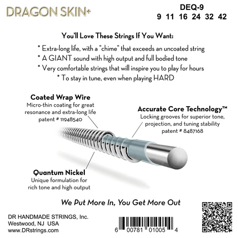 Dragon Skin+™ strings sound huge, are easy to play, and have outstanding endurance. Dragon Skin+ upgrades both the core and the wrap wires to be exceptionally musical, balanced, and loud. Accurate Core Technology™ creates grooves on the core to cradle the wrap wire, allowing the strings to ring out to their full potential. Designed to feel and sound better, Dragon Skin+ is unlike anything out there. The difference is real.
