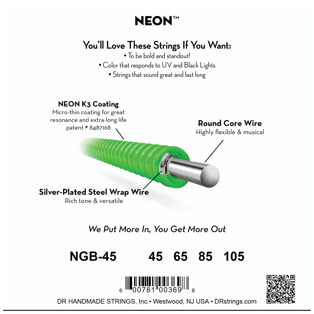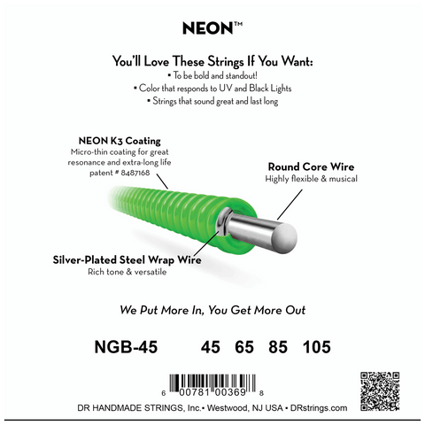 DR Strings NGB-45 Medium 4-String NEON™ Green bass guitar strings with K3™ Technology