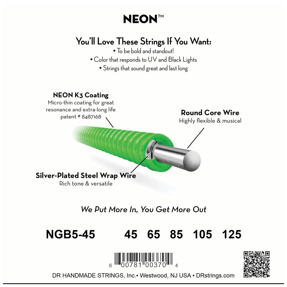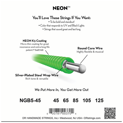 DR Strings NGB-45 Medium 4-String NEON™ Green bass guitar strings with K3™ Technology