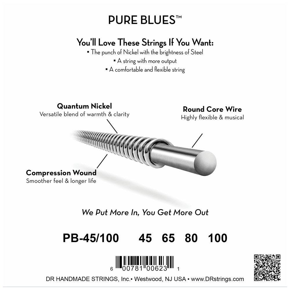 DR Pure Blues bass strings combine the warm tone of pure nickel with the brightness and edge of stainless steel for a rich and tonally balanced string that is perfect for players who demand versatility. Whether you play fingerstyle, with a pick, or slap, your bass will come alive with a full bottom, colorful mids, and bright articulate highs.