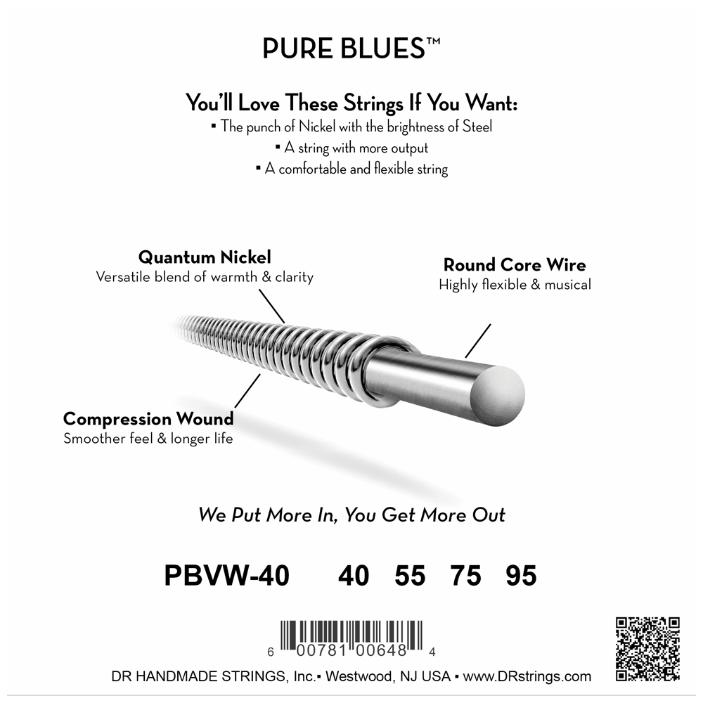 DR Pure Blues bass strings combine the warm tone of pure nickel with the brightness and edge of stainless steel for a rich and tonally balanced string that is perfect for players who demand versatility. Whether you play fingerstyle, with a pick, or slap, your bass will come alive with a full bottom, colorful mids, and bright articulate highs.