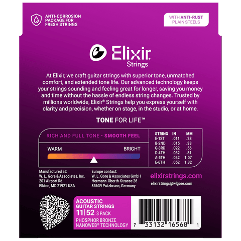 Play for longer without compromising tone and feel with what experienced players worldwide say are the best acoustic guitar string on the market. Elixir Strings protects the whole string - not only the outer string surface but also the gaps between the windings where dirt, sweat and gunk build up killing your tone. Anti-Rust Plating protects the plain steel strings ensuring long-lasting tone for the entire set. Elixir Strings retain their out-of-the-box tone longer than any other brand’s strings.