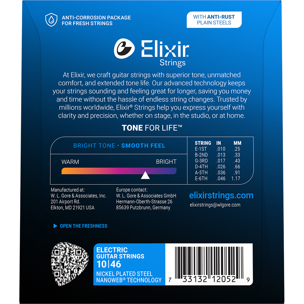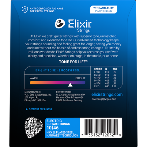 Elixir Strings deliver the presence, punch, and detail of traditional electric guitar strings. But when it comes to tone life, there is no comparison. Players report with Elixir Strings their tone lasts longer than any other string, uncoated or coated. Nanoweb coated wound strings and rust resistant steel strings. #12052