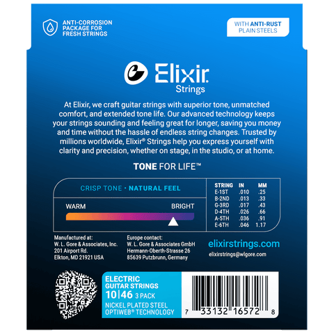 Play for longer without compromising tone and feel with electric guitar strings trusted by experienced players worldwide. Elixir® Strings protects the whole string - not only the outer string surface but also the gaps between the windings where dirt, sweat and gunk build up killing your tone. Anti-Rust Plating protects the plain steel strings ensuring long-lasting tone for the entire set. Elixir Strings retain their out-of-the-box tone longer than any other brand’s strings.